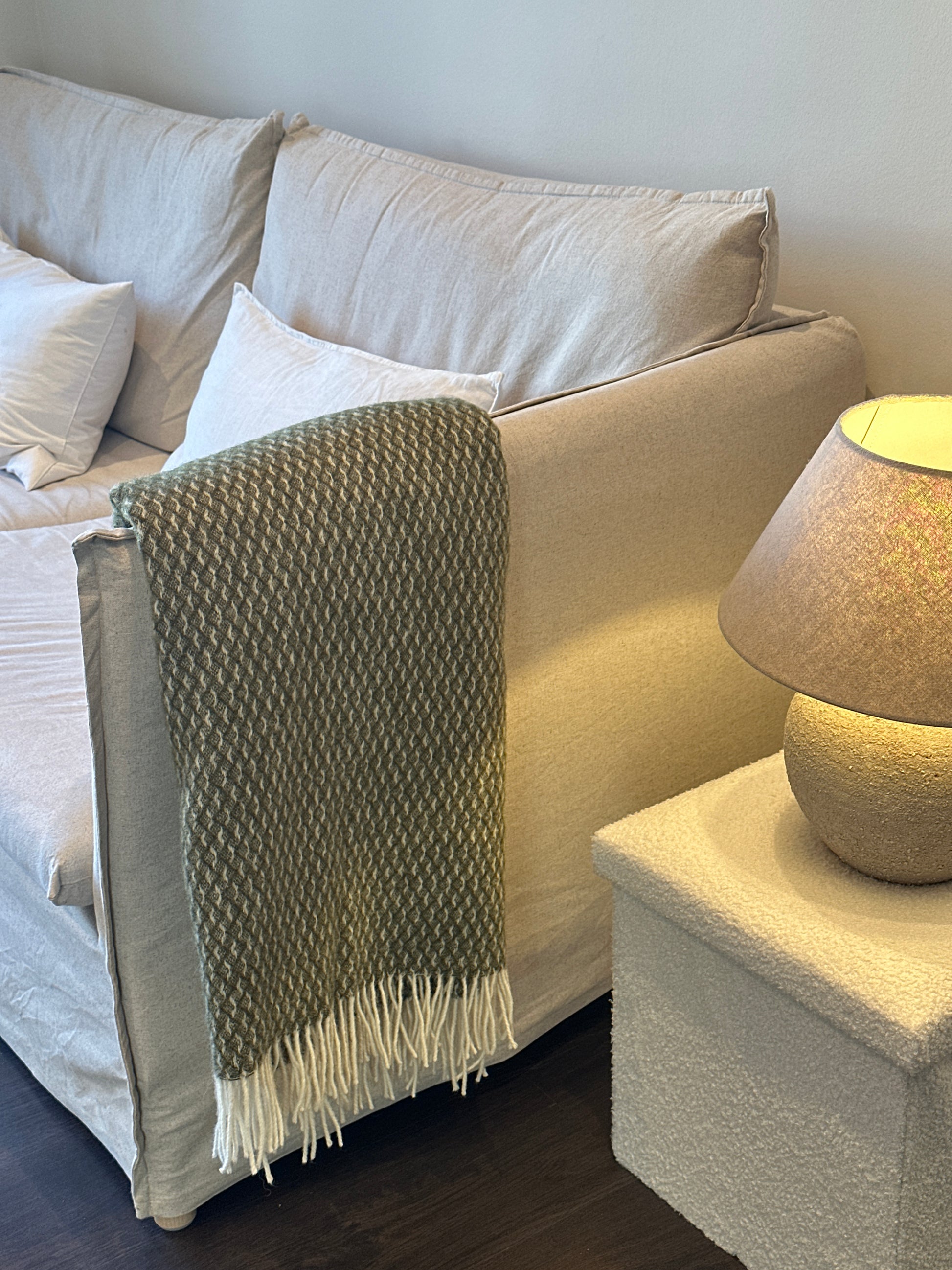 Manta BonBon, confeccionada con 100% lana pura de Nueva Zelanda. Suave pero duradera, esta lujosa manta verde añade un toque natural de elegancia a cualquier habitación. Perfecta para noches acogedoras, como capa en la ropa de cama o como un elegante acento en tu sofá.